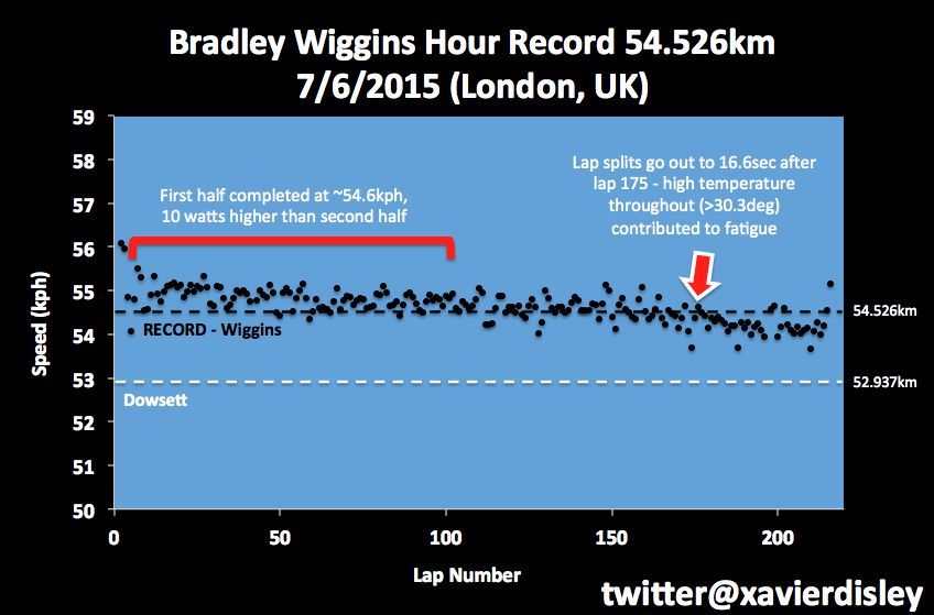 Different reports of barometric pressure of 1031-1036hPa and air temp of 30.3C inside the track mean that Wiggins must have been exceptionally aerodynamic and recent work on his bike and position at the track suggest some good aero gains were made.